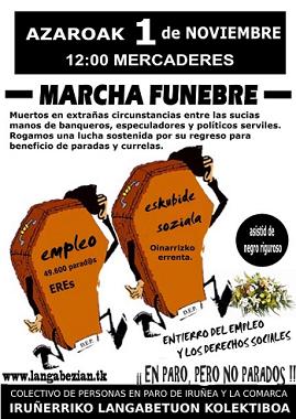 Marcha fúnebre por el empleo y los derechos sociales, hace no mucho celebramos en la plaza de mercaderes de Iruña el funeral del estado de bienestar, miles de personas relegadas a la exclusión social y la miseria, con remotas posibilidades de encontrar un empleo o acceder a una protección social cada vez mas restrictiva y en la práctica inaccesible para mucha gente. Marcha funebre también por las personas dependientes, por los desempleados, por lass jubiladas obligadas a pagar las medicinas, por los jóvenes con una educación cada vez peor y un futuro mas que negro. Marcha funebre porque el empleo y los mas elementales derechos sociales no son ya mas que una lejana quimera