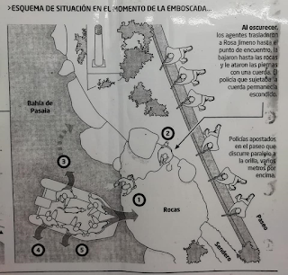 Salimos, me pasaron de San Pedro a San Juan, en el sitio que tenía la cita con mis compañeros ahí me bajaron a las rocas, me ataron los pies con una cuerda y uno de los policías estaba detrás mío, escondido en un hueco entre las rocas. Cuando iban a llegar mis compañeros en la barca, a la señal que no pasaba nada era unas señales con una linterna. Vinieron y se acercaron con la barca y nada más acercarse a la barca, les iba a decir que estaba lleno de policías, pero no me dio tiempo. Empezaron a disparara, a mi me tiraron al suelo. Me cogieron a volandas y me subieron arriba. Allí arriba , me tuvieron tumbada bocabajo en el suelo y con un policía apuntándome y lo único que oía eran tiros.