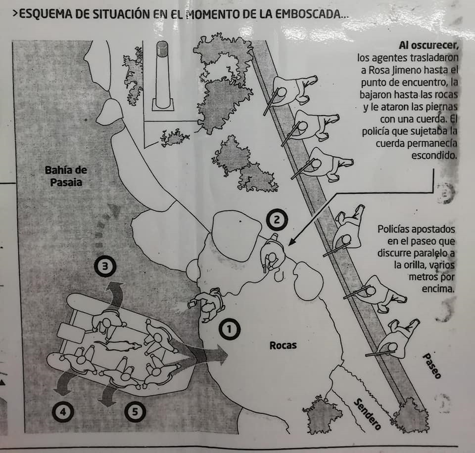 Llegamos al punto que habíamos quedado de antemano. Íbamos desarmados. Es importante por lo que sucedió más tarde. Yo llevaba la embarcación. Vimos a Rosa en el lugar convenido, puse la proa contra la roca, y eché un cabo a Rosa. Desembarcaron primero Pelitxo y Kurro. Le pasé un cabo a Curro para que no se separase la embarcación de las rocas, y cuando yo me encontraba agachado cogiendo a mi Beltza por el lomo y le dije a Kurro ‘toma a Beltza’, se escuchó un ‘alto policía’ y seguido cientos de disparos.