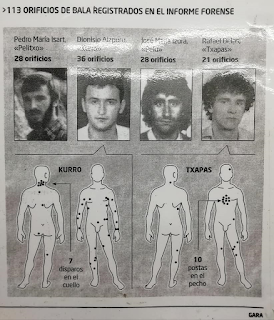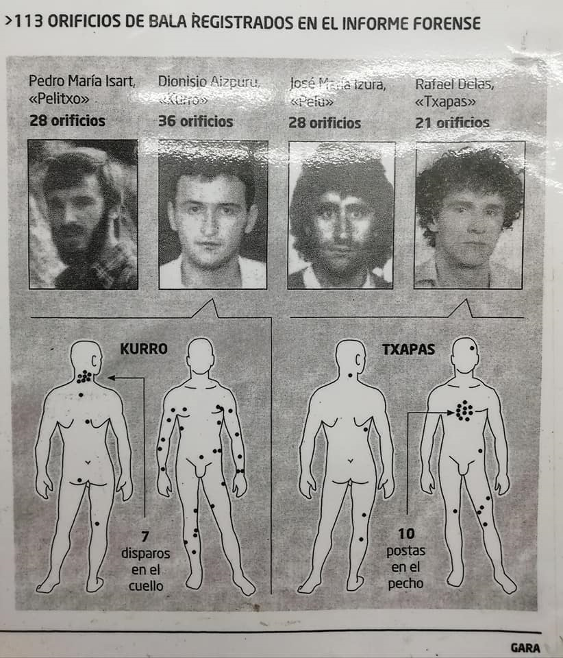 El 22 de marzo se cumplen ya 37 años de la emboscada en la bahía de Pasaia y que supuso el “fusilamiento” a manos de la policía española de cuatro militantes de los Comandos Autónomos Anticapitalistas. Aquella noche la sangre de José María Izura ‘Pelu’ y Pedro María Isart ‘Pelitxo’, Rafael Delas ‘Txapas’ y Dionisio Aizpuru ‘Kurro’ inundó la bahía y las rocas de Pasaia. La autopsia practicada a los fallecidos reveló que Dionisio Aizpuru presentaba en su cuerpo 36 orificios de bala, tanto de entrada como de salida, Pedro María Isart, tenía 28, Juan María Isidro Izura, también presentaba 28 y Rafael Delas Aizcorbe, 21.
