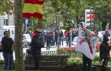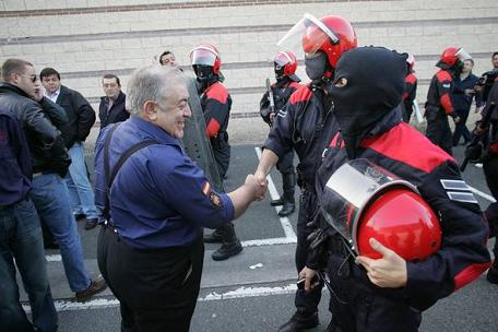 Esta imagen de miembros de la policia vascongada, dando la mano a ultras fascistas contrasta con la manera en que reprimen a los antifascistas que acuden a denunciar la presencia fascista en las calles de Euskal Herria