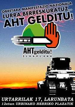 Hacemos por ello un llamamiento a toda la población de Euskal Herria a participar en esta manifestación a la zona de obras que partirá a las 12h desde la plaza de Urbina bajo el lema “AHT GELDITU! LURRA BERRESKURATU!” para expresar nuestra firme voluntad de seguir impulsando la lucha en defensa de la tierra y demostrar que mediante la movilización popular es posible parar el TAV. Previo a la manifestación, el jueves día 15, AHT GELDITU! realizará asimismo concentraciones descentralizadas en diferentes localidades ante las sedes de los partidos políticos promotores de esta destructiva infraestructura (PNV, PSOE, UPN, PP y EA) para mantener la exigencia de debate sobre el TAV y denunciar su actitud antidemocrática en relación a este controvertido proyecto.