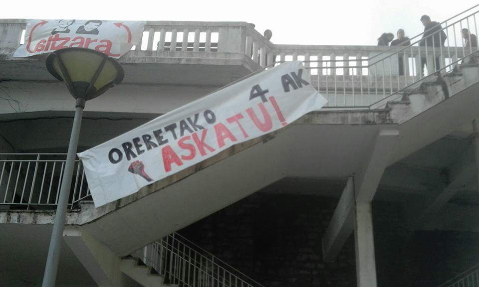 El pasado fin de semana se celebraron las fiestas de Herrera, un barrio de Donostia. Allí los compañeros de la asamblea de Donostia, recién creada, colgaron dos pancartas de apoyo a los cuatro detenidos con el fin de mostrar solidaridad ante la represión que acababan de sufrir por parte del estado. Ese mismo día recibíamos la fatídica noticia de la decisión del Tribunal Supremo el cuál se pronunció a favor de la Audiencia Nacional, siendo esto decisivo para que los acusados puedan ser juzgados como terroristas.
