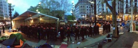 Nos hemos despertado con la visita de la Ertzantza en AskeGunea. No ha sido su presencia lo que nos ha sorprendido, sino, el ejercito enviado por el Gobierno Vasco a detener a los 8 jóvenes. Han llegado pasadas las 6 de la manaña, pero para entonces, un muro humano de más de 1000 personas protegía ya a los condenados. Durante tres horas la Ertzantza se ha empleado con dureza para sacar uno a uno a las personas que formábamos el muro popular. En respuesta, los allí presentes nos hemos agarrado entre sí, codo con codo. Frente a la violencia de los Ertzainas, se ha respondido con resistencia pacifica. Desde AskeGunea denunciamos que hemos recibido amenazas, insultos y golpes. Estamos recogiendo testimonios para hacer un balance de heridos. Muchos han sido los que hemos recibido porrazos, patadas y puñetazos, así como a los que les han torcido los brazos y pies. También han abundado las amenazas verbales. Cabría resaltar que los Ertzainas han arremetido contra los periodistas. Por todo ello, queremos denunciar la actuación de la Ertzantza hoy en Donostia.
