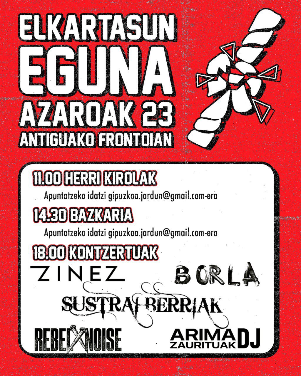 Eguna goizeko 11etan hasiko da Herri Kirolekin. Hauetan lau kirol mota eramango dira aurrera: harri jasoketa, lokotxak, txingak eta trantza. Parte hartzeko lau pertsonaz osatutako taldeak izan behar dira eta apuntatzeko gipuzkoa.jardun@gmail.com-era email bat bidali behar da taldearen izena ipiniz. Izen ematea 20 euroko kostua izango du. Ondoren 14:30etan bazkaria egongo da eta bukatzeko ,18:00etan, kontzertuak;Rebel Noise, Arima Zaurituak DJ, Sustrai Berriak, Zinez eta Borla taldeen eskutik.