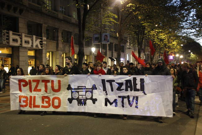 A pesar de la militarización y la represión, desde “Piztu Bilbo, Itzali MTV” queremos agradecer a todas las personas y colectivos su participación e implicación en las movilizaciones populares llevadas a cabo esta semana: desde el jueves hemos llenado las calles de Bilbo de protagonismo popular, de lucha y de solidaridad, organizando múltiples actividades y movilizaciones. En particular, la manifestación del sábado a la tarde puso sobre la mesa el rechazo popular a los grandes eventos y al modelo de ciudad neo-liberal que nos están imponiendo, planteando que otro modelo (de ciudad, de territorio y de vida) es posible, un modelo popular, construido desde abajo, desde los barrios y por las desposeídas y subalternas que habitan esta ciudad.