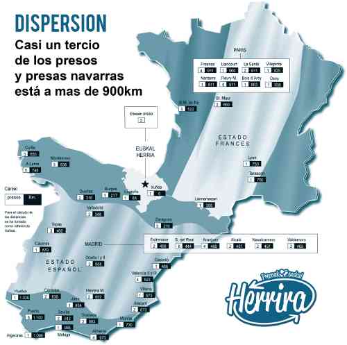 Los datos reflejan las medidas de excepción que se aplican al colectivo de presos y presas políticas vascas. De los 100 navarros y navarras encarceladas, el 31% está a más de 900 km, el 44% a más de 700 y el 66% a más de 500.