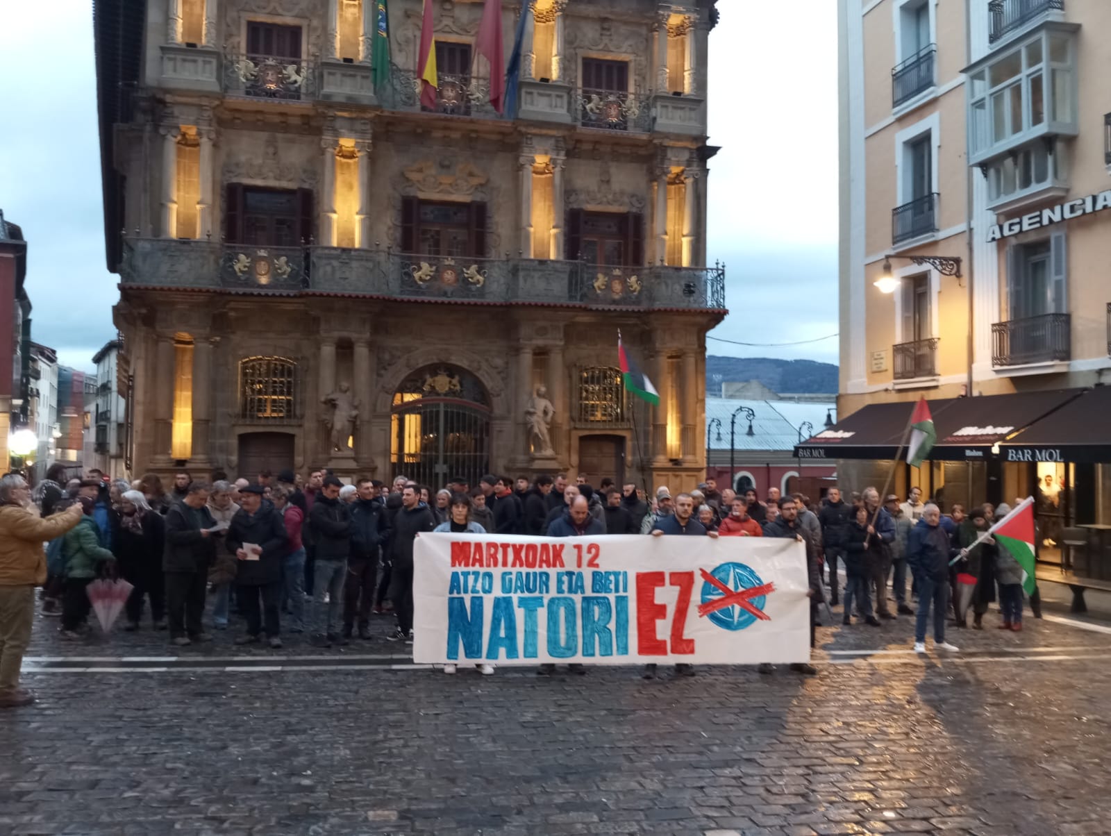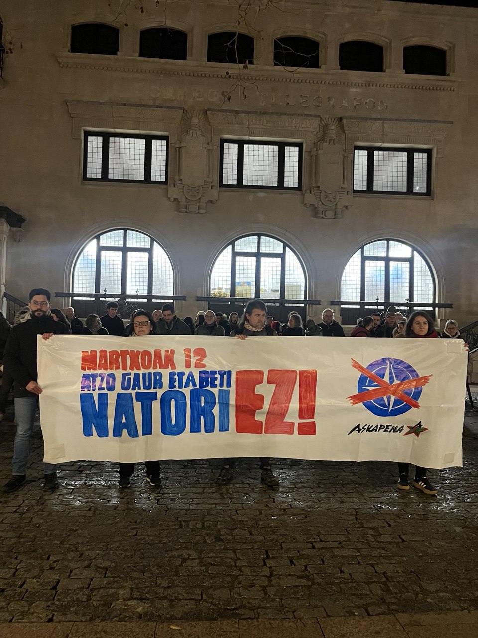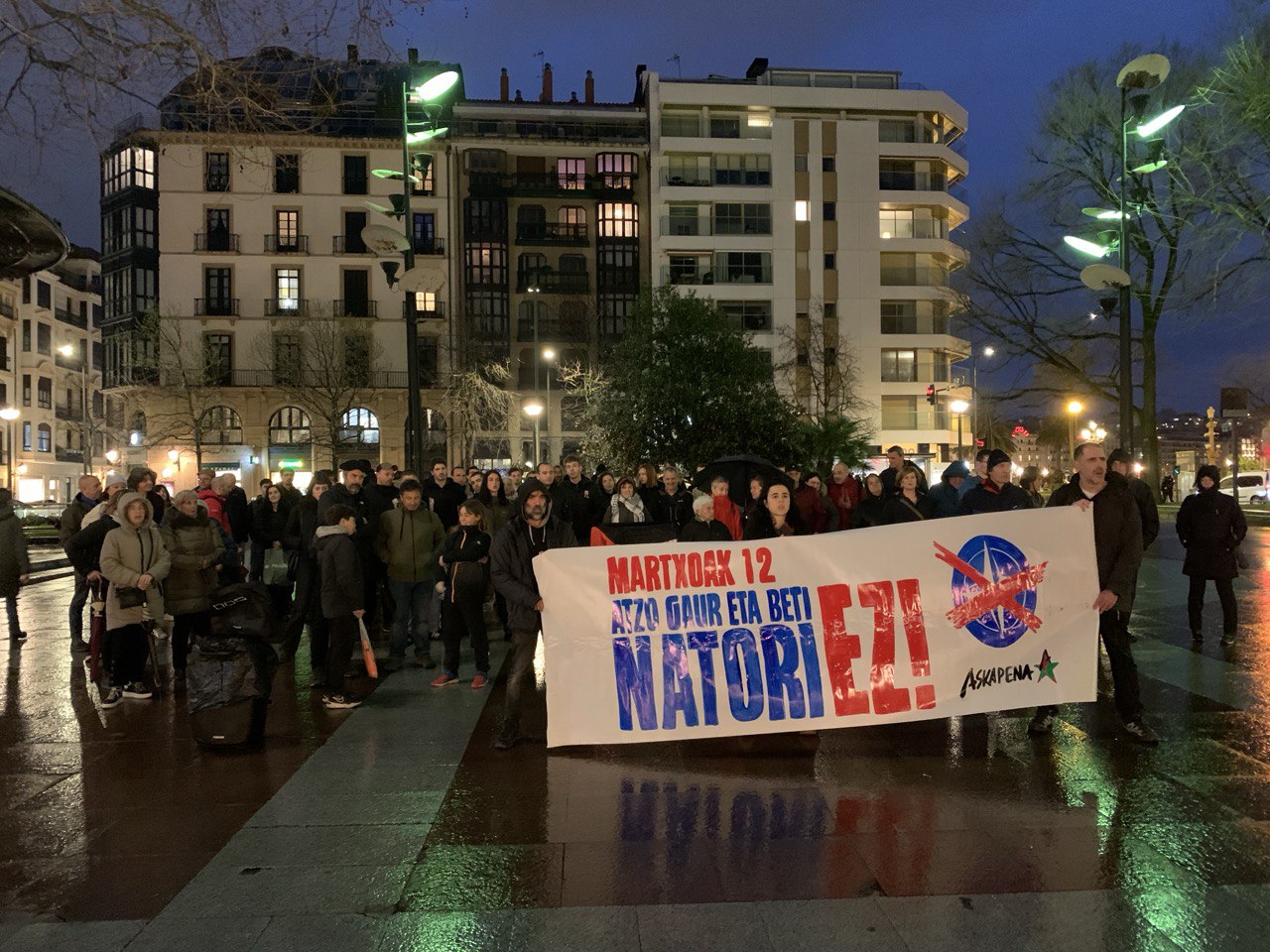 Al finalizar las movilizaciones leyeron un comunicado en el que denunciaron “la ofensiva imperialista llevada adelante por la burguesía occidental y por su brazo armado, la OTAN, contra de los pueblos trabajadores del Sur Global: Asis occidental Sahel, Europa oriental, Abya Yala, Asia orlental… Según Askapena esta ofensiva se traduce, en el centro imperialista, “en guerra de clases contra los trabajadores y nuestras condiciones de vida”. Acto seguido afirmaron que la guerra imperialista es una necesidad histórica para al capitalismo, por dos motivos: “Mantener el reparto imperialista del mundo” y “la guerra como respuesta directa a la crisis capitalista, como herramienta para contrarrestar la caída de la tasa de ganancia y activar un nuevo ciclo de acumulación”.