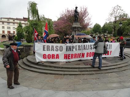 Una veintena de personas se concentraron este lluvioso mediodia en Gernika tras una pancarta que rezaba "Eraso Inperialistarik Ez!! Gora Herrien Borondatea!!" para mostrar su repulsa hacia las diferentes agresiones de carácter imperialista que vienen dándose en diferentes puntos del mundo.