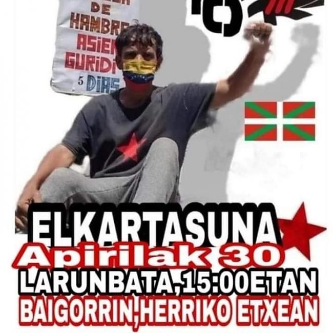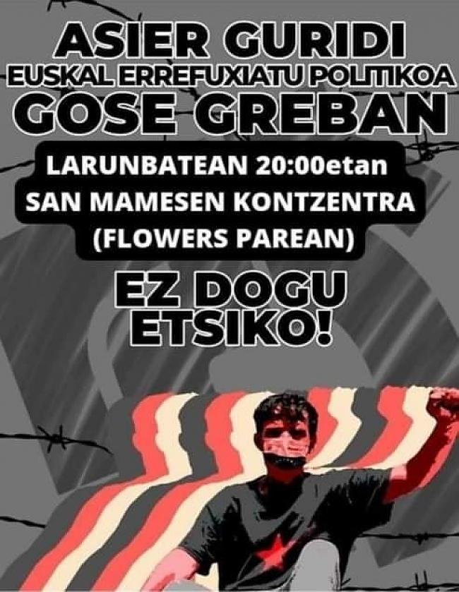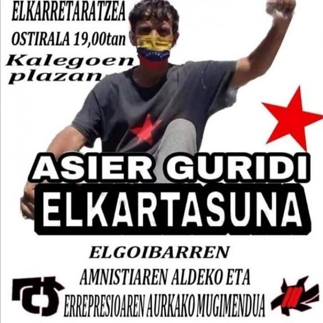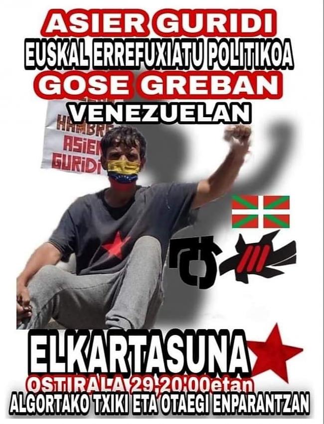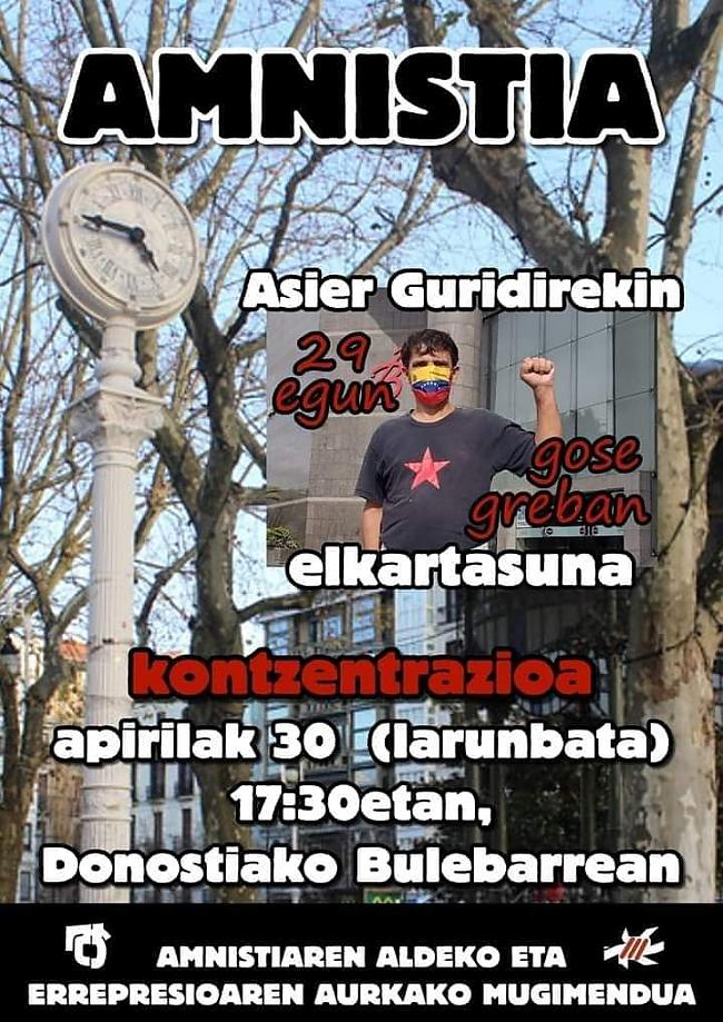 Cuando se cumple un mes del inicio de la huelga de hambre del refugiado político vasco Asier Guridi frente al Consulado español en Caracas exigiendo su derecho a la identidad ante la negativa del gobierno español a darle su pasaporte y la negativa del gobierno venezolano a tramitarle la Cédula de Identidad, varias concentraciones se han convocado en varios puntos de Euskal Herria durante estos días.