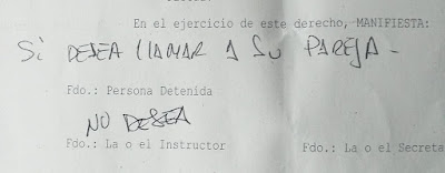 En las 5 páginas hay un apartado para que el detenido, yo, lo firme. Pone "no desea" en todas ellas. Y es verdad que no lo hubiese firmado, pero si ni me lo han leído ni dejado que lo lea yo...