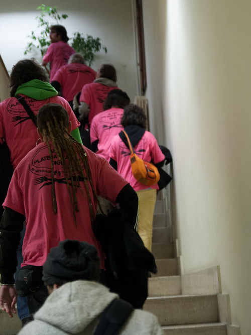 Eraikinaren kanpo aldean baraugileek pankarta zabaldu dute eta lelo desberdinak oihukatzeari ekin diote. Foruzaintzak orduan pankarta ixtera behartu ditu, komunikatu gabeko elkarretaratzea zela aitzakipean eta baraugileak identifikatu ditu. Hala eta guziz ere, ordu erdiz AHTren aurkako leloak botatzen eta eskuorriak banatzen jarraitu dute.