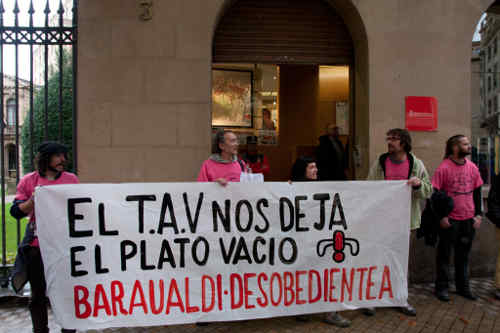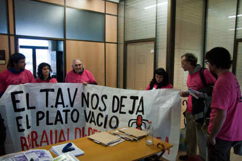 A las 11:30 las diez ayunantes navarras anti TAV se han colado en el Departamento de Obras Públicas del Gobierno de Navarra, responsable del proyecto y del comienzo de obras del TAV en Navarra. El guarda jurado que vigila la entrada al edificio no ha logrado impedir que accedieran al mismo por lo que han subido a la sexta planta donde se ubica el despacho del consejero de Obras Públicas y Vivienda Luis Zarraluki, donde han desplegado una pancarta relativa a la semana de ayuno. La secretaria del consejero ha insistido a las desobedientes que no les podía recibir ya que estaba reunido y no tenían cita previa. Cuando han acudido efectivos de la Policía Foral han conminado a los presentes a desalojar los pasillos. Estas han insistido en que tenían intención de seguir el ayuno de una semana anti TAV en dicho pasillo “sin crear molestias a los funcionarios” a lo que la Policía Foral ha respondido que debían abandonar el edificio por lo que finalmente así lo han hecho.