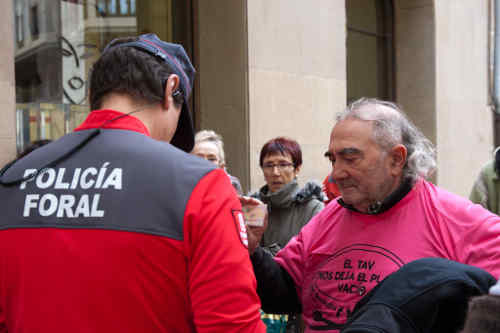 En el exterior del edificio las ayunantes han desplegado la pancarta y han comenzado a gritar consignas anti TAV. La Policía Foral ha obligado a retirar la pancarta alegando que era una concentración no comunicada y ha identificado a las ayunantes. A pesar de ello y durante media hora han seguido coreando consignas contra el TAV y repartiendo información a los transeuntes.