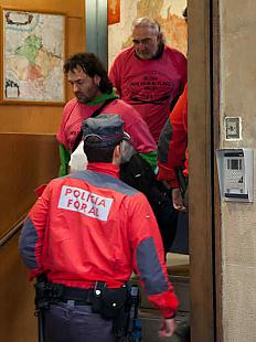 Foruzaintza bertaratu denean baraugileei pasabideak hustu zitzatela eskatu die. Hauek ordea, AHTren aurkako baraualdia bertan jarraitzeko asmoa zutela berretsi dute “funtzionariei inolako eragozpenik sortu gabe”, baina foruzaintzak alde egiteko exijitu ondoren eraikina utzi dute.