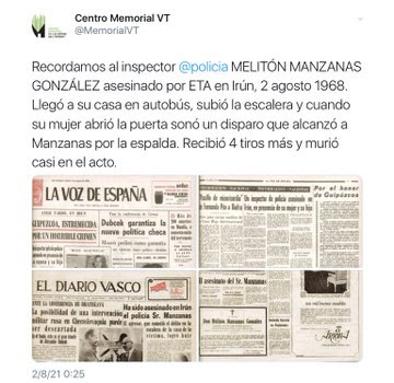 - Accion armada de ETA 02/08/68 fallece por disparos Meliton Manzanas, un fascista fiel ejecutor de la represión franquista en Euskadi Sur