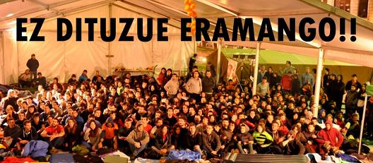 Casi 800 jóvenes van a pasar la noche en Askegune, en defensa de los 8 condenados por su militancia política. Las informaciones periodisticas apuntan a que es inminente la aparición de la policia vascongada para detener y entregar a las cárceles españolas a los 8 jóvenes. Tendrán primero que derribar el muro de la solidaridad y el compromiso.