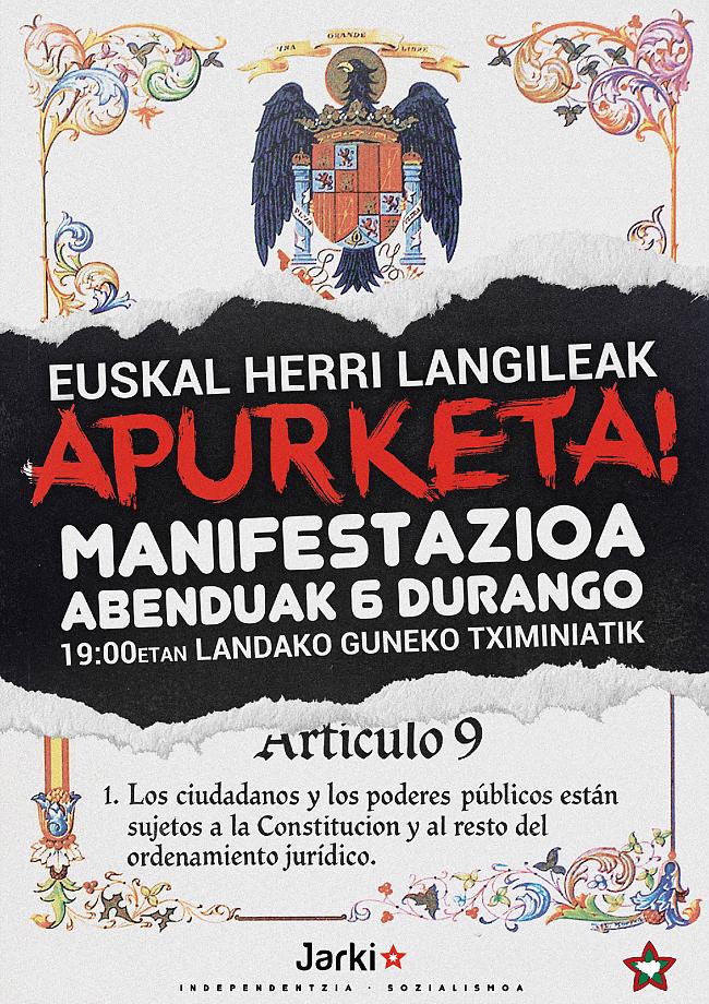 Urtero bezala, manifestazio nazionala deitu du JARKI antolakunde iarultzaileak abenduaren 6an, Espainiako Konstituzioa onartu zuten egunean. Manifestaldia “Euskal Herri Langileak apurketa” lelo pean egingo dute, eta arratsaldeko 19:00etan abiatuko da Durangoko Landako gunetik.