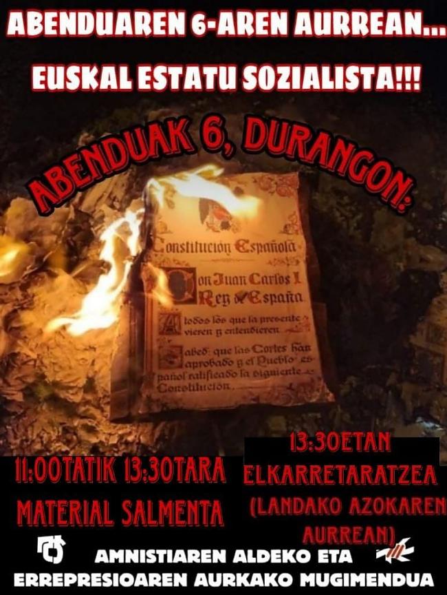 Espainiako konstituzioaren egun honetan, ezerk ez gaitu batzen Espainiako batasun santuaren izenean torturatu, hil, okupatu eta esplotatu gaituztenak. Ezerk ez gaitu lotzen arrazakeriarekin, faxismoarekin, espainolismoarekin, jakobinismoarekin eta kapitalarekin, euskalduna, frantsesa, espainiarra edo nazioartekoa izan.