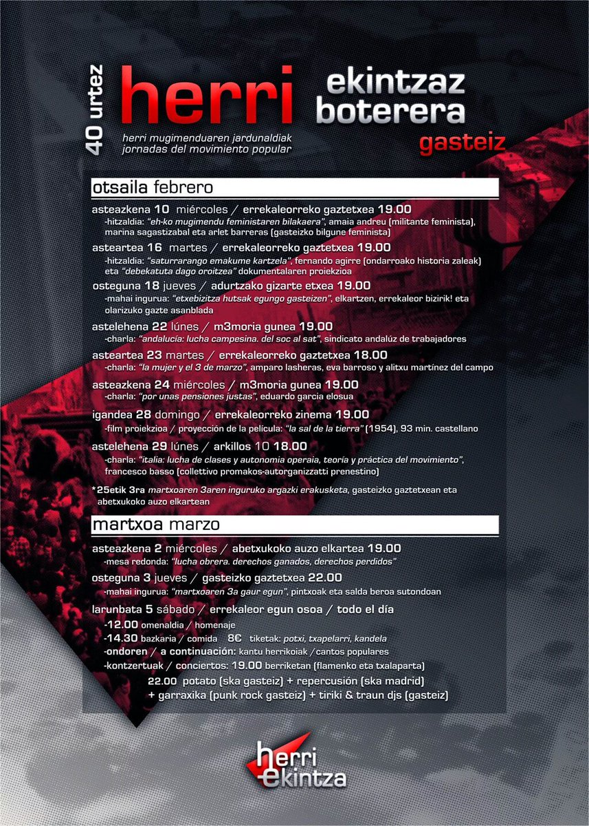Por todo esto, hemos organizado un programa que desde el 10 de febrero hasta el sábado 5 de marzo tendrá lugar en diferentes espacios de Gasteiz , un programa con actividades diversas donde se abordarán temáticas actuales bajo la perspectiva de lo que siempre fue, es y será una lucha popular, el 3 de marzo.