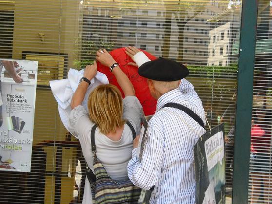 En el paseo, han sido varios los ciudadanos que han visto con simpatia la acción y tan sólo cabe destacar, como nota cutre, la actitud-rambo de un guarda de seguridad que muy celoso de sus funciones ha tratado de impedir que se colocase el “punto rojo” en la oficina de la diputación. El pobre no sabe que la crisis también va con él y que por mucho que obedezca a su amo, mañana puede estar en la larguisima lista de parados y paradas de Barakaldo, Ezkerraldea y Euskal Herria.