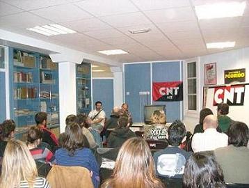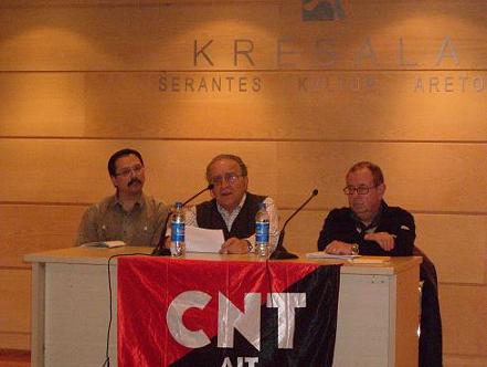 El martes 24, en la sala Kresala de Santurtzi, recorrimos los más de 100 años de historia del anarquismo de la mano de Miguel Ángel Rivero y Juan Gómez Perin, de la Asociación Isaac Puente de Vitoria, e Iñaki Astoreka, compañero de CNT-Bilbao. Los antecedentes del anarquismo se remontan a antes de los del nacionalismo o el socialismo. En sus orígenes los sindicatos eran sociedades obreras de resistencia al capital. Las cuales englobaban muchos aspectos de la vida (anticlericalismo, sociedades libres, grupos de teatro…). En 1910 la fundación de la CNT supuso un antes y un después, pasándose de las sociedades obreras al sindicato único, y con ello de la resistencia al ataque al capital. Cuando la CNT nace en Euskadi le cuesta avanzar, principalmente por la represión del poder; el cual tenía un miedo visceral a que Euskadi fuera como Barcelona. Cuando empezaba a crecer se produjo el ya mencionado montaje de Altos Hornos. 140 detenidos, cuyo abogado defensor apareció con la cara ensangrentada en el juicio. El golpe de Estado que desato la posterior Guerra Civil fue aniquilado en muchos sitios por el llamado pueblo en armas. En aquellos lugares en los que triunfo la clase trabajadora se llevo a cabo una autentica revolución social caracterizada por las colectivizaciones. En Álava triunfo el golpe, deteniendo y fusilando a muchos anarquistas (entre ellos Isaac Puente). En Irun los milicianos anarquistas resistieron heroicamente, tras la retirada de los nacionalistas, sin prácticamente medios, frente a un ejército organizado. El 19 de julio del 37 cae Bilbao, terminando la guerra en Euskadi. En esta zona, durante el periodo de guerra se organizaron 6 batallones anarquistas (Durruti, Malatesta, Sacco y Vanzetti…). Después de la guerra, en seguida se empieza a organizar la gente, a pesar de los cientos de detenidos y asesinados. En el año 44 tuvo lugar un pleno clandestino, en el que también participaron navarros, contabilizándose 1400 afiliados. La CNT mantuvo cierta fuerza, a pesar de la represión, hasta la entrada de España en la ONU. Durante el franquismo asistimos al desmantelamiento de la CNT. Legalizada en 1977, la CNT juega un papel muy importante durante esos años. En el 78 un mitin en Montjuic congrego a 300.000 personas. Martín Villa, ministro franquista, llego a afirmar que el movimiento anarquista le preocupaba mas que ETA. La CNT se opone manifiestamente a los Pactos de la Moncloa, claves en el proceso de transacción. Produciéndose en Barcelona el conocido como caso Scala (en el que murieron trabajadores afiliados a la CNT). Demostrándose con creces que fue un montaje del gobierno para acabar con la CNT. A partir de entonces se intensificaron las detenciones y se criminalizo mediaticamente a la CNT, vinculándola a grupos terroristas. Esto provocó una desbandada general dentro de la organización. Aprovechándose esta situación desde el poder para destruirla desde dentro. Produciéndose entonces las escisiones. Muchos compañeros cansados de esta situación y de las luchas internas, se desvincularon del movimiento. Hoy en día la CNT esta formada por sindicatos activos que siguen luchando, contando cada sindicato con vida propia e iniciativa. Existiendo solidaridad entre sindicatos y compañeros. Organización contraria a los comités de empresa que supusieron una traición al movimiento obrero revolucionario, acabándose con las asambleas de fábrica y domesticándose las huelgas. Y es que para que exista un sindicato de trabajadores como arma de defensa, este debe ser autónomo (independiente económicamente) siendo los propios trabajadores los que lo hagan funcionar. A la CNT se le ha negado tanto el patrimonio histórico como el patrimonio sindical acumulado.