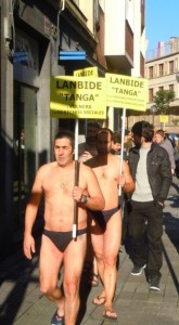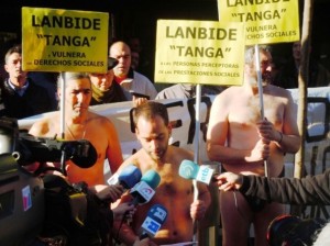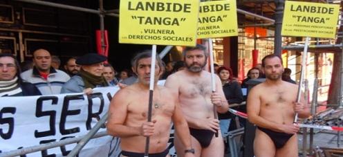 Varios miembros de colectivos sociales de Bizkaia desnudos ataviados unicamente con un tanga han participado esta mañana en una concentración ante la sede de Lanbide de la calle Alameda Mazarredo para denunciar que el organismo dirigido por el Gobierno de Lakua ″tanga y vulnera los derechos sociales″.