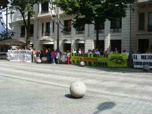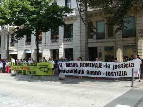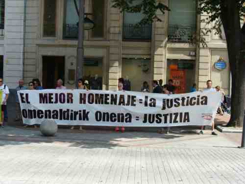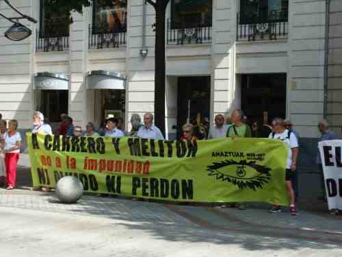 Tras dos pancartas en las que podian leerse los textos "A Carrero y Melitón ni olvido ni perdón" y "Omenaldirik onena, JUSTIZIA" la asociación de vicitmas del régimen franquista Ahaztuak 1936-1977 nos hemos concentrado frente al Palacio de la Diputación de Bizkaia para denunciar una vez más la política de utilización de las victimas del franquismo por parte de instituciones y políticos profesionales en base a intesreses de marketing o electorales.
