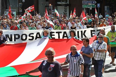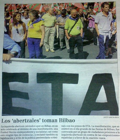 - Cierto. Ni siquiera el lema de la pancarta es amenazante. “INPOSAKETARIK EZ. NAZIOA GARA” (No a las imposiciones. Somos una nación). Que sólo les ha faltado pedirlo por favor, no me jodas. Y el aspecto de la peña es de lo más normal. Bueno, espera ¡lo tengo!