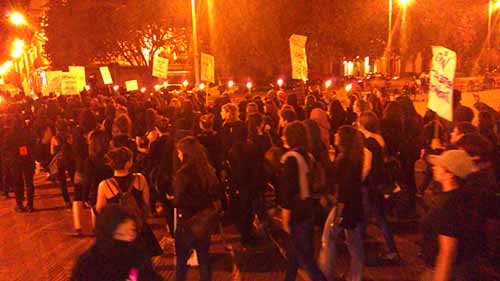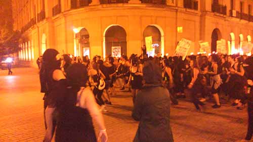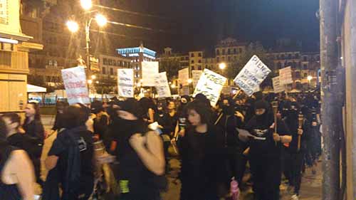 La manifestación ha salido de Plaza del Castillo, cientos de mujeres de negro y con la caras tapadas abrian la marcha, al pasar por San Nicolás se han encendido antorchas y se han hecho dos cordones rodeando la cabecera de la manifestación. La marcha ha contado con un grupo de batucada y la afluencia de personas ha ido creciendo cada vez más. Se han coreado infinidad de consignas "Gora borroka feminista", "Akosatzea ez da ligatzea" o "Matxirulo, vamos a por ti!".