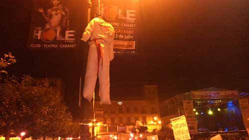 tras recorrer todo Alde Zaharra en un ambiente combativo la manifestación ha llegado a la Plaza del Castillo de nuevo, donde se ha colgado un muñeco que representaba un agresor sexista.