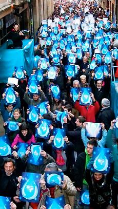 Cada persona que ha asistido, llevaba una cartulina en la cual iba dibujada esa gota (tanta hori) y que por momentos sólo era eso lo que se podia ver desde los balcones de Durango, miles de gotas solidarias.