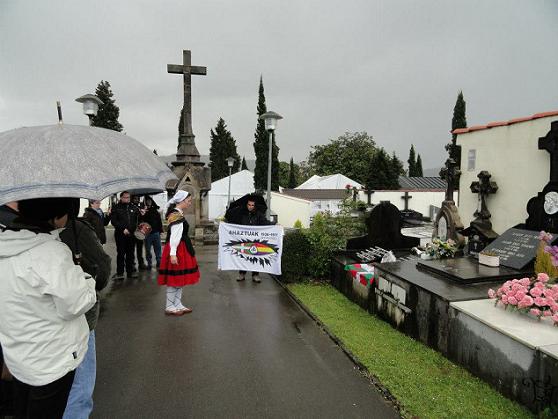 Varias decenas de personas han acudido al cementerio de Gernika para recordar a Iñaki Garai Lejarreta y Blanca Salegi Allende, matrimonio vecino de esta villa muertos a tiros por la Guardia Civil el 15 de Mayo de 1975 por albergar en su casa al miembro de la organización ETA Jesús Mari Markiegi, "Motriko". El evento ha estado convocado por la asociación de victimas del régimen franquista Ahaztuak 1936-1977 dentro de su dinámica "Biktima guztiak, borrokalari guztiak / Todos ls luchadores, todas las victimas".