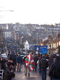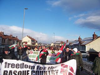Aunque había nevado por la noche, la marcha empezó con el sol brillando. Militantes de los comítes de solidaridad de Dublin, Limerick y Belfast, llevaron ikurrinas y tres pancartas: la primera era la de los CISV con el lema "LIBERTAD PARA EL PAIS VASCO!", la segunda en contra de la extración de dos Vascos de Belfast al estado español y la tercera llena de fotos de los presos politicos Vascos.