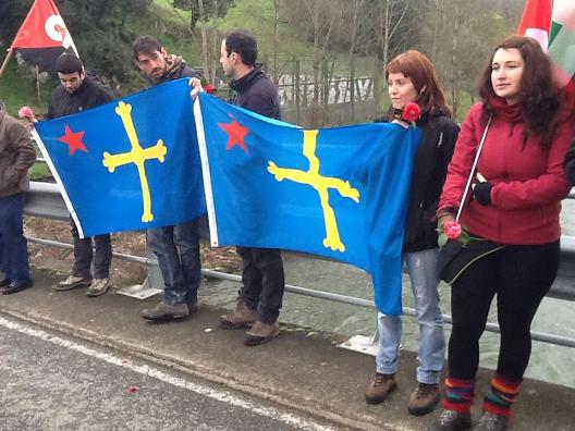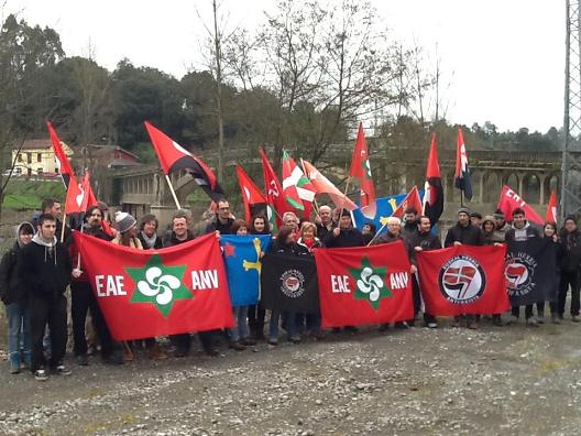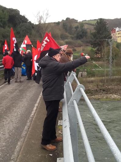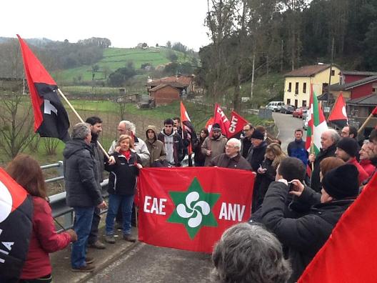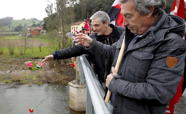 Antes de subir a Areces para realizar un acto de homenaje en el «pradón» el grupo (también estaba integrado por militantes asturianos de la CNT) hizo una parada en el puente sobre el Nalón que comunica las localidades de Valduno y Vega de Anzo. Allí también desplegaron sus banderas, lanzaron claveles y rosas al río y pronunciaron sus discursos. Antxon Gómez no esquivó la polémica sobre la discutida participación de combatientes vascos en la Guerra Civil fuera de las fronteras de Euskadi. «Siempre se ha dicho que los vascos no nos implicamos por la República, pero lo cierto es que aquí mataron a 120 militantes de ANV y de la izquierda aberzale y sus cuerpos quedaron desperdigados por estos prados. Participaron en una acción solidaria importante y queremos que se recuperen sus cuerpos», manifestó.