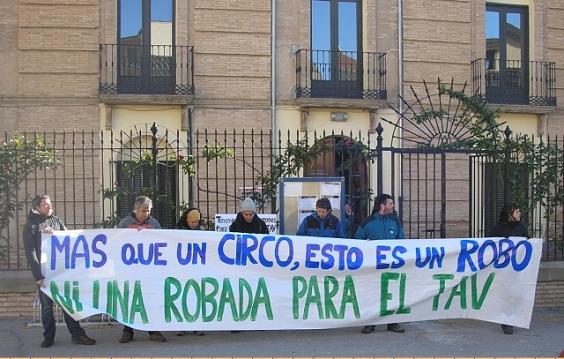 Nos encontramos a las puertas del Ayuntamiento de Villafranca para mostrar nuestro rechazo a las expropiaciones que se pretenden realizar del subtramo Castejón-Cadreita, imprescindibles para continuar las obras del TAV en Navarra. A pesar de los fuertes recortes en los presupuestos generales, especialmente graves en las partidas sociales, el Gobierno de Navarra sigue emperrado en continuar su construcción. Ya ha dedicado este año 137 millones de euros a esta obra. Sin saber siquiera si tendrá financiación en el resto de los tramos, desde Pamplona hacia Guipuzcoa y desde Castejón a Zaragoza.
