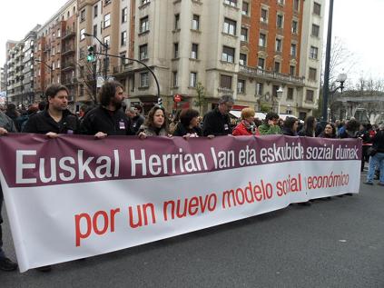 La marcha que ha recorrido el centro de Bilbo con el lema "Por un nuevo modelo social y económico, Euskal herrian lan eta eskubide sozial duinak", ha estado organizada por los sindicatos ELA, LAB, ESK, STEE-EILAS, EHNE, Hiru, CGT-LKN y CNT y más de medio centenar de organizaciones sociales, todas ellas con un amplio curriculum de pelea contra los deshaucios, contra la exclusión, el paro y otras lacras que acarrea el capitalismo.