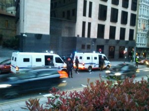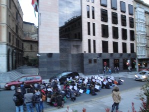 Una vez acabada la manifestación, varias decenas de jóvenes han realizado una sentada ante la sede central del PNV, Sabin Etxea, en protesta por los recortes aplicados por el Gobierno Vascongado hasta que ha hecho su aparición la policía autonóma española que ha disuelto con gran violencia la sentada.