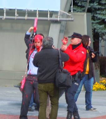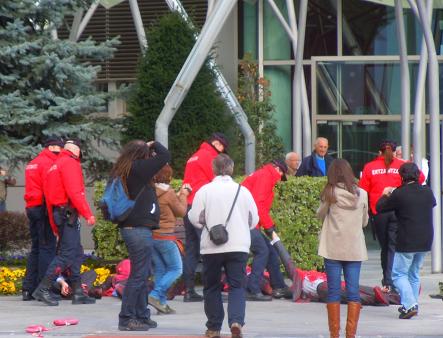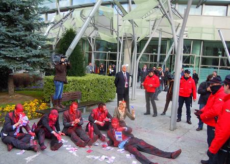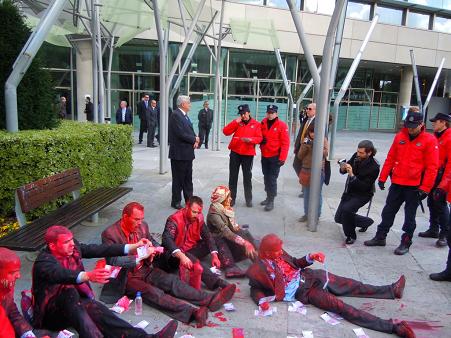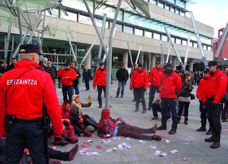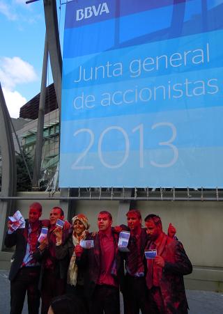 Con motivo de la celebración hoy de la junta de accionistas del BBVA, la “Plataforma contra el BBVA”, ha realizado, un año más, una impactante acción de denuncia en la entrada del Palacio de Congresos “Euskalduna”, lugar donde se estaba celebrando este sarao.