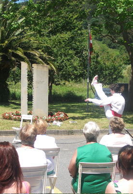El acto finalizaría con una dantzari local uniendo al son de la musica y con una cinta de colores rojo, blanco y verde a todos los presentes -algunos de ellos portando letreros con los nombres de los batallones de gudaris y milicianos donde combatieron los vecinos de la localidad- y uniendo despues esa cinta con el monolito cercano en el que puede leerse "Izan zirelako gara eta garelako izango dira", momento este que arrancaría las lagrimas de muchas de las personas presentes.