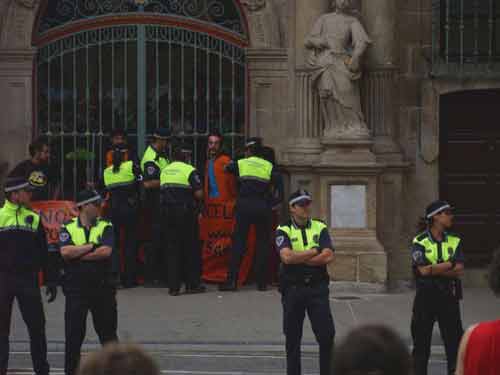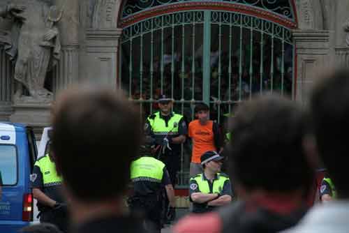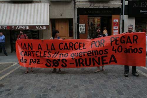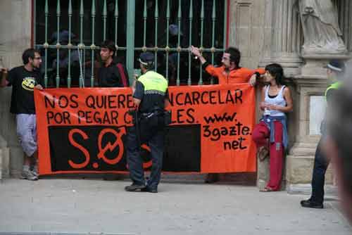 Ayer dos activistas se encadenaban a las puertas del consistorio de Iruñea sosteniendo una pancarta que decía "Nos quieren encarcelar por pegar carteles". Protestaban por la situación en la que se encuentra Ian Tabar.Tras varias negociaciones fueron detenidos los dos encadenados por la policía municipal, que tomo la zona en poco tiempo.