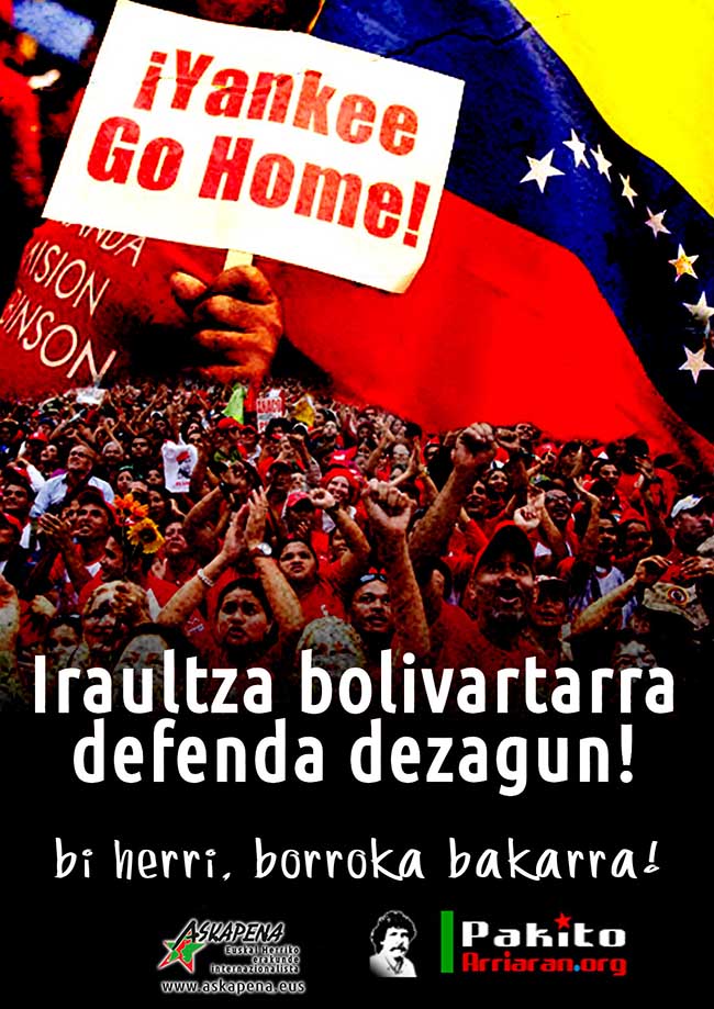 Euskal herritarrok asko dugu jokoan Venezuelan. Iraultza bolivartarra erortzeak ondorio larriak izango lituzke bai Latinoamerikan eta baita Euskal Herrian ere. Momentu larri honetan ez dago tarteko posizio injerenzistentzako tokirik, bakearen zein proiektu askatzaileen alde gaudenoi Venezuelako herrialdearen burujabetza defendatzea dagokigu, eta horrek iraultza bolivartarra defendatzea esan nahi du, elkartasun internazionalista biderkatzea.