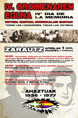 El próximo 1 de Abril, domingo la asociación de victimas del golpe de estado, de la represión y del régimen franquista Ahaztuak 1936-1977 haremos realidad el IV Oroimenaren Eguna / IV Dia de la Memoria.