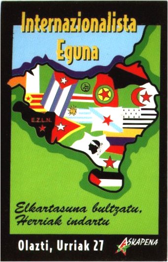 Este fin de semana (de viernes a domingo) en Hernani Askapena ha organizado unas jornadas “Bizi elkartasun internazionalista” (“Vive la solidaridad internacionalista”) que analizarán el camino seguido por el internacionalismo vasco, para empezar, pero le seguirán aportaciones de Guillermo Paniagua sobre “Herramientas para un mundo internacionalista”. También representantes de Panafricanism Today explicarán el trabajo que desarrollan, a la vez que se escucharán las experiencias desde el Sáhara, a cargo de Garazi Hach Embarek, de Rene Behoteguy (militante boliviano) y de miembros de la organización comunista griega KOE. Cerrarán, entre otros, representantes del Movimiento Sin Tierra de Brasil (MST) y la charla “Sin Cuba nada sería igual” con Milagros Acea (Cuba), Souradjou Ali (república de Benin) y José Manzaneda (Euskal Herria) de la asociación Euskadi-Cuba.