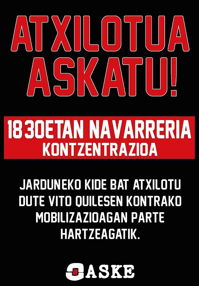 Ante esta situación, no nos queda más remedio que organizarnos y luchar. Por eso, la organización antirrepresiva ASKE os invita a participar en la concentración que celebraremos esta tarde a las 18:30 en la plaza de la Nabarrería de Pamplona.