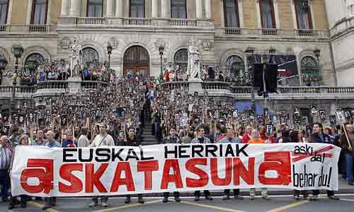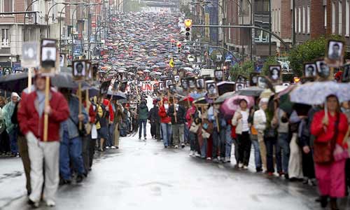 «Euskal Herriak askatasuna behar du. Aski da!». Este era el lema de la pancarta que portaban los procesados. Junto a ellos, una fotografía de Maite Díaz de Heredia, encausada también en este sumario, y presa desde la operación policial de Segura contra la Mesa Nacional de Batasuna. Detrás, más de 15.000 personas -15.840 según el recuento de GARA-, y por delante, más de setecientas personas, tantas como prisioneros políticos vascos, cuyas fotografías portaban.