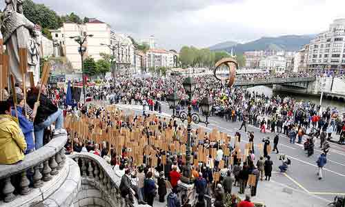 En total, fueron más de 16.000 las personas que marcharon, a ratos bajo la lluvia, desde la plaza Aita Donostia hasta el Ayuntamiento de la capital vizcaina, donde un acto político puso fin a la movilización. Entre los asistentes, numerosos representantes de agentes sociales y sindicales vascos que quisieron sumarse a la marcha.