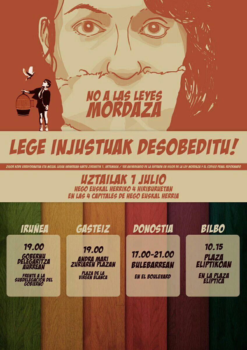 Guzti horrengatik, mobilizazioa deitu dugu uztailaren 1erako. Ekimen independiente eta deszentralizatua, baina Pirineotik beherako euskal hiriburuen artean koordinatutakoa. Guztiak bat gatoz egindako irakurketan, adostua izan dena eta egunotan lau hiriburuetan errepikatuko duguna. Baita deialdiaren leloan ere: No a las Leyes Mordaza. Lege injustuak desobeditu. Mobilizazioek ezaugarri desberdinak agertuko dituzte tokian toki, baina hiriburu guztietan kolektibo sozial eta politiko anitzen multzoek antolatu dute deialdia. Ezberdinen arteko lan komun honek mozal legeek sortzen duten ardura eta haserrearen zabalaren erakusgarriak direla uste dugu.