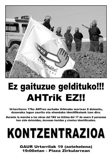 Hoy lunes 19 a las 19:00 en la plaza Circular de Bilbao, se ha convocado una concentración en apoyo a los detenidos el 17 en Urbina y contra la brutalidad policial.