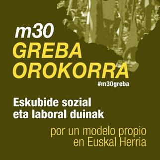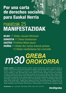 ►Maiatzaren 30eko greba orokorra antolatu duten kolektiboek, hainbat mobilizazio egingo dituzte Maiatzaren 25ean, Larunbata. Mobilizazioak murrizketen aurka eta lan eskubideen zein eskubide sozialen alde izango dira. Mobilizazioak izango dira: Iruñea 12:30ean San Lorenzon, 17:30ean Bilbon (Bihotz sakratuan) eta Donostian (Boulevarden) eta 19:00etan Gasteizko Bilbo plazan.